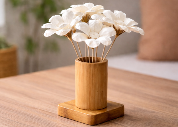 This handcrafted bamboo flower arrangement by Tromila Nongsek of Meghalaya is made using natural bamboo and handmade bamboo paper, thoughtfully combined into a durable and visually balanced décor piece. Each flower is individually shaped by hand, with layered paper petals that give the arrangement a soft, natural appearance while maintaining its structure over time. The process requires patience and precision, from preparing the bamboo paper to assembling each bloom and fixing it securely in place.