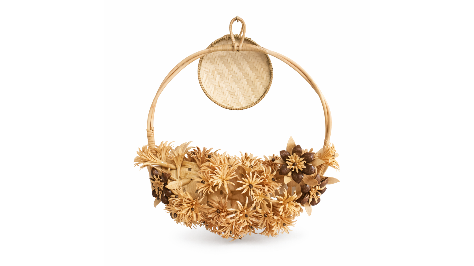 This handcrafted bamboo décor piece is designed as a floral wall hanging, built around a circular frame and detailed with layered bamboo flowers. The arrangement draws from natural forms, using carefully shaped bamboo strips to create petal-like textures and clustered floral patterns. The structure is lightweight yet sturdy, with a curved handle-like frame that allows it to be easily hung on walls. At the top, a woven bamboo disc adds balance to the composition, while the dense floral work forms the visual centerpiece of the piece. Each flower element is individually shaped and assembled by hand, giving the piece depth and variation rather than a flat or uniform appearance. The natural tones of bamboo range from light beige to deeper earthy shades, adding contrast without the use of artificial colors. This type of craft reflects the use of bamboo not just as a functional material, but also as a medium for decorative expression. The design works well in indoor settings such as living rooms, entryways, or gallery walls where handcrafted details can be appreciated up close. Because it is handmade, slight differences in shape, tone, and arrangement are expected. These variations are part of the craft process and make each piece distinct.